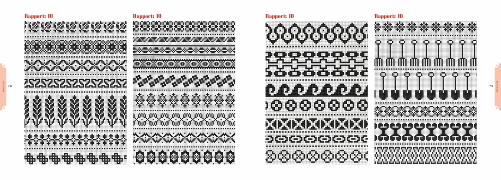 Besonders praktisch: Die Muster sind so sortiert, dass sofort erkennbar ist, wie viele Kästchen/Maschen/Stiche ein Rapport benötigt –