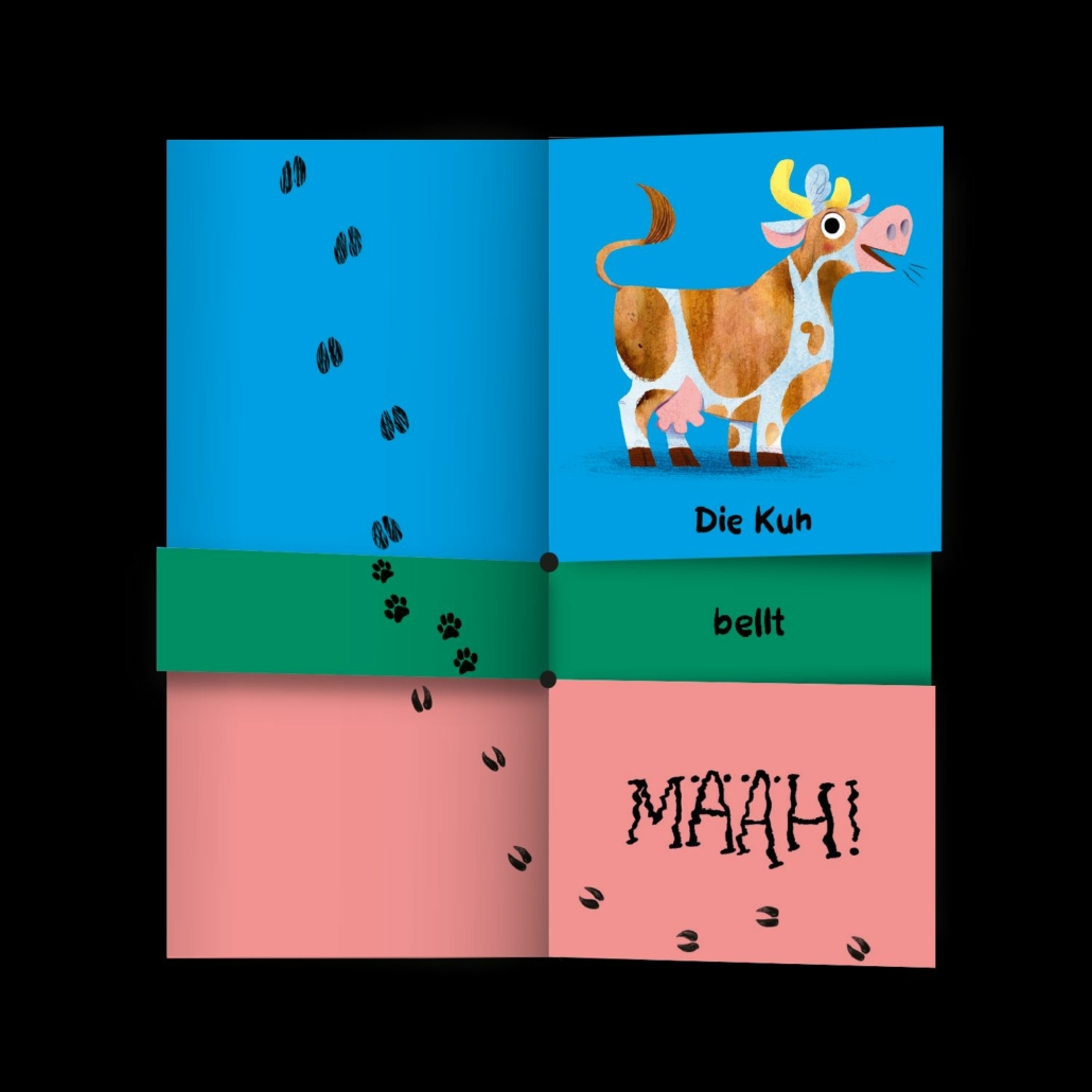 Die Kuh macht „Muuh“, das Schaf blökt „Määh“ und das Schwein quiekt „Oink“. Doch wie ruft der Hahn? Wer heult da „Ohuuu“? Und wieso bellt der Frosch plötzlich „Määh“?