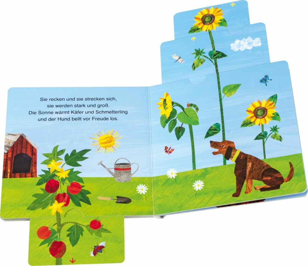 Im Garten ist viel los! Die kleine Raupe Nimmersatt staunt, was da wächst und welche Tiere dort krabbeln und summen und umherfliegen.