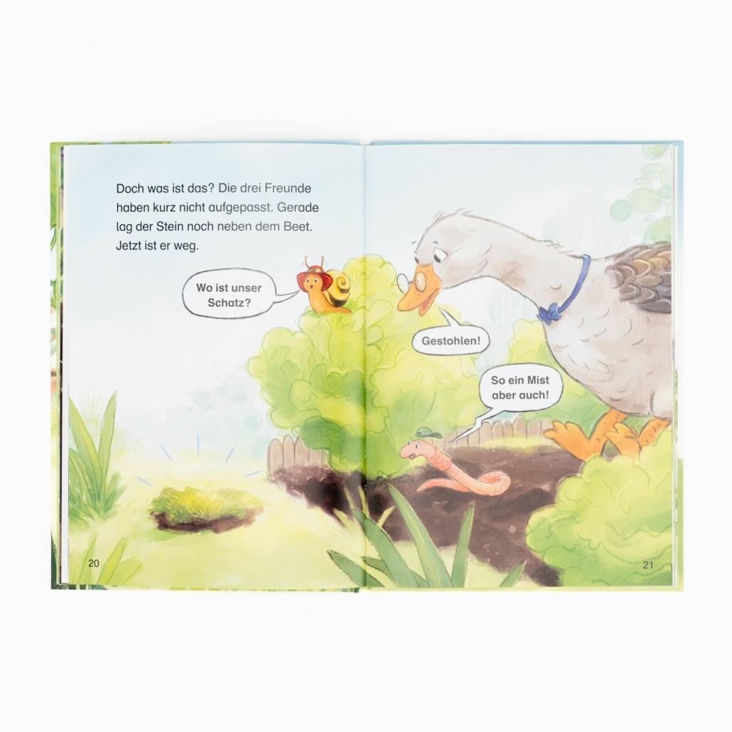 Doch kaum lassen sie das Fundstück kurz aus den Augen, ist es verschwunden. So ein Mist aber auch! Wer hat den Glitzerstein geklaut?